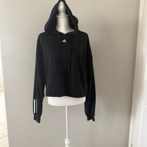Sporty cropped hoodie with signature Adidas logo. Features drawstring hood and striped sleeve details. Modern athletic design with ribbed cuffs and hem.