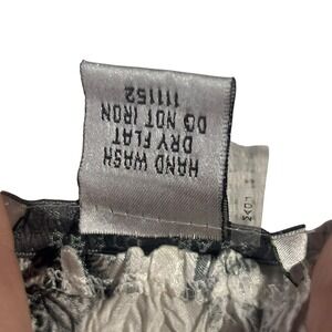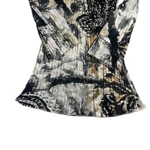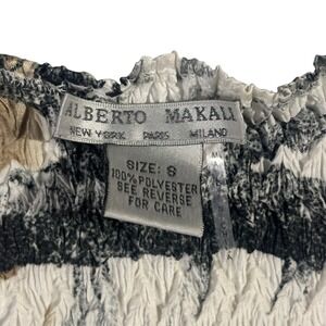 ALBERTO MAKALI tunic top in size small featuring a captivating abstract print with black, white, and tan tones. This top showcases a flattering square neckline adorned with delicate black lace trim and intricate circular embellishments. The smocked bodice provides a comfortable and form-fitting silhouette, while the long bell sleeves add a touch of drama. The hemline features a subtle pleating effect, creating a flowing and elegant finish. Crafted from 100% polyester, this garment is designed for hand washing and is not suitable for ironing.