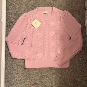 Charming pink sweater with floral knit design. Features puff sleeves and ribbed cuffs. Perfect for a cozy, stylish look. New with tags