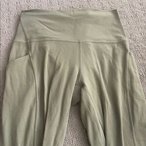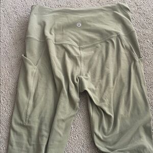Lululemon leggings in a fun green color. Pulling throughout but still in wearable condition! Side pockets.