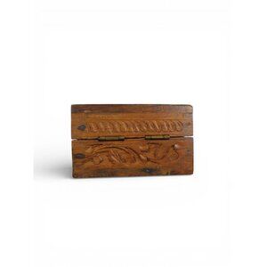A hand-carved wooden trinket box featuring pierced cutwork on the lid, carved foliate details along the sides, and a hinged brass closure. The warm, time-softened wood shows honest wear, tool marks, and patina consistent with age and hand craftsmanship.