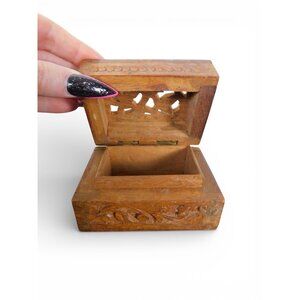 Hand Carved Wooden Trinket Box Pierced Lid Vintage Folk Art