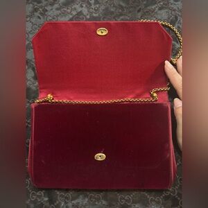 Authentic Gucci velvet shoulder bag in a rich burgundy color. Features a structured rectangular silhouette with a soft velvet exterior, gold-tone chain strap, and gold Gucci logo hardware on the front flap. Elegant and timeless design, perfect for evening or special occasions.