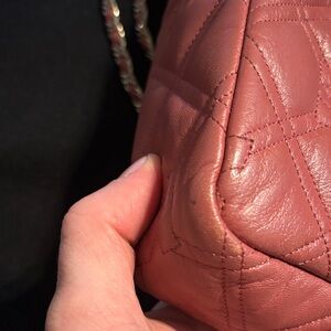 There are corner rubs. There is a mark on the bottom. There is a mark on the back on the front. There's a black mark 2 little black marks on the hardware there are scratches, rubs marks, and possible tarnishing.