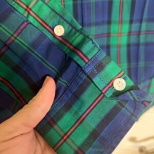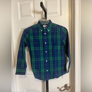 This Crewcuts Boys' Button-Down Shirt in size 8 features a plaid pattern, long sleeves, and a collared neckline with a button closure. Made from a comfortable cotton blend material, this shirt is suitable for travel, parties, or casual wear during the winter, fall, and spring seasons. The shirt also includes a pocket detail on the front, making it both stylish and practical for young boys. The classic preppy style adds a touch of school-themed charm to any outfit.