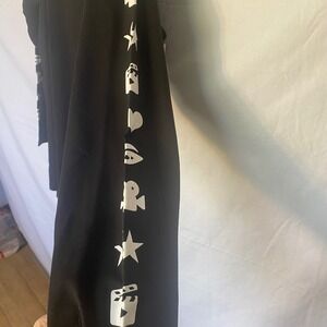 Marina Rinaldi graphic print long sleeve t-shirt. This black top showcases playful white graphics down the sleeves, including stars, ghosts, hearts, and film clapperboards, alongside a cluster of sparkling rhinestones forming a heart on one sleeve. A versatile piece perfect for casual outings or a stylish lounge look.