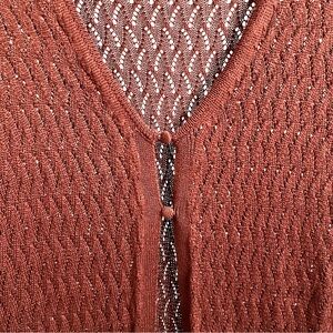 • Medium. Pointelle knot design. Two- button front. 85% rayon. 15% linen. A classic piece to turn to time after time. 48 inches long.