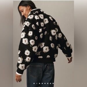 Anthropologie Sherpa fleece bomber jacket. Black base with white flowers. Perfect for layering. NWT. NBW