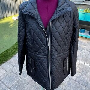Elegant black outerwear with quilted design. Ideal for chilly days.