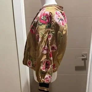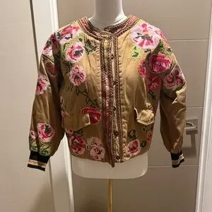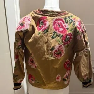 This stylish women's jacket features vibrant floral embroidery on a tan background, perfect for adding a touch of elegance to any outfit.