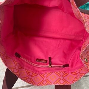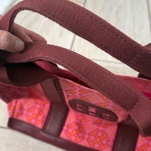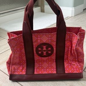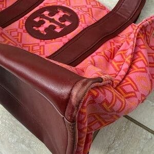 Tory Burch Ella Geometric Printed Tote bag. Pink and orange color with burgundy leather. In good but used condition. Some wear on corners and fading/dirt.