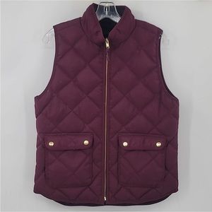 J CREW Excursion Quilted Down fill Vest. features include: Standing collar, zip front closure, front pockets with snaps, machine washable, versatile dark burgundy color. Measures 17” armpit to armpit, waist 17”, length 23”. In like new condition. Size small.
