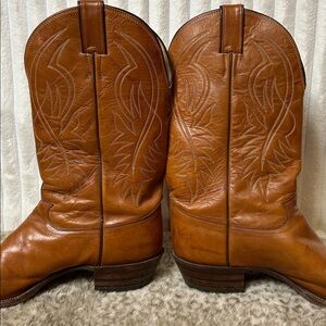 Vintage Justin USA Style 1632 Mens Tan Leather Western Cowboy boots in good preowned condition some minor crackling in piping and light scuff mark on inside of boot see all pictures above