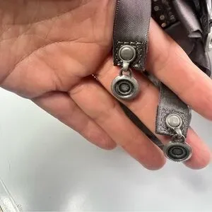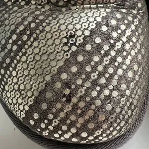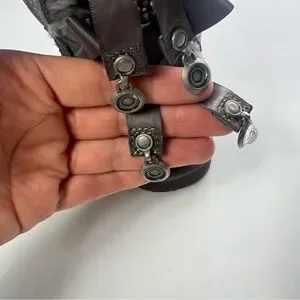 Shimmery suede with metallic stripe bead print upper 2 back satin bows with crystal charms ( 2 crystals are missing in one boot and 3 on the other) but they are still in good condition and looking cute!please see photos for details the inside sole has wear but nothing a new insoles wont fix!