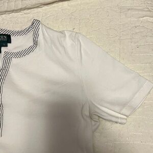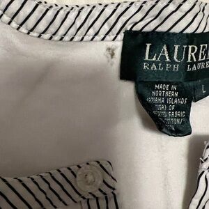 Lauren Ralph Lauren top, size L, white with blue, buttons, GUC, pit to pit 19 inches, length 21 inches, there is a flaw with a small hole near the tag