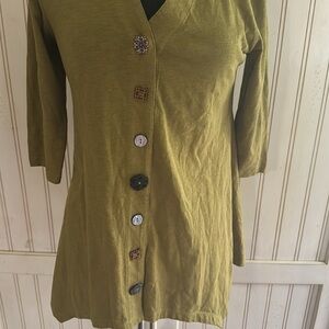 EUC Soft Surroundings 100% Cotton Danielle Stylish Earth tone olive button-down shirt with unique buttons. Perfect for casual wear.