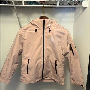 Light pink ski jacket with soft lining. Features secure zip pockets. Ideal for cold weather activities. Extremely warm ski jacket.