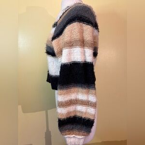 Cozy striped sweater with a cropped design. Features a mix of black, cream, and brown eyelash thread. Perfect for casual wear.
