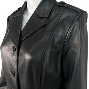 Sleek black leather jacket. Long design with button closure. Features large front pockets.
