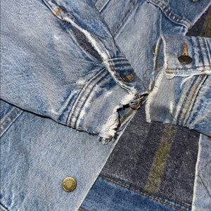 Elevate your style with this classic blue denim jacket featuring a stylish tan collar. Perfect for any casual occasion.