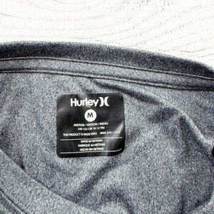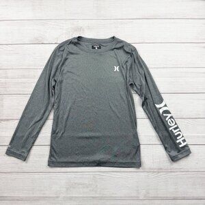 Hurley long sleeve performance shirt in kids size M (10/12). Heather gray athletic top with small Hurley logo on the chest and large Hurley text down the sleeve. Lightweight, moisture-wicking Nike Dri-FIT fabric for comfort during sports, gym, or everyday wear. Gently used condition.