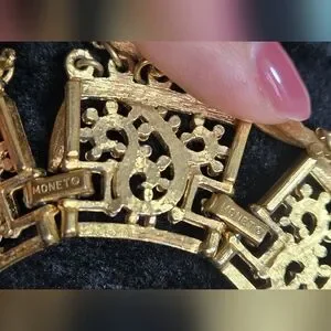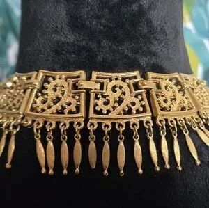 This is one of Monet's most irresistible collectible sets, with intricate scroll filigree and subtle Etruscan aura--included in the coveted 1973 "Paisley" series...The spellbinding necklace has a seductive drippy fringe all around its ornate paisley design, absolutely ravishing! It measures @16 1/2" long and offers a removable extender link for closer fit...It is signed on the fold over closures...Center width is an impressive 2 3/4"