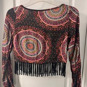 Vibrant crop top with intricate patterns. Features long sleeves and fringe hem. Perfect for a boho look.