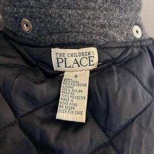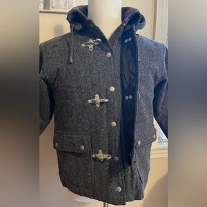 Cozy gray wool blend utility jacket. Features sturdy metal clasps. Large front pockets and hood.