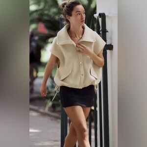 Chic cream vest featuring a button-up front. Includes drawstring hem and two front pockets.