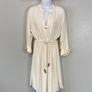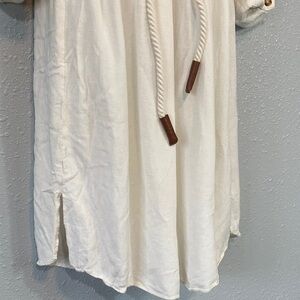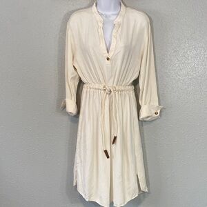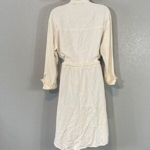 Chic off-white top with a subtle texture. Perfect for any occasion. Viscose/line/cotton blend. Super comfortable. Rope belt. 3/4 sleeves. Mid-length. Size large. Pit to pit 20”. Waist 16”. Shoulder to hem 41”. GUC.