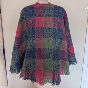 Vibrant poncho with pink, green, and blue checkered pattern. Features fringe detailing.