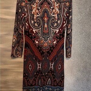 This elegant sheath dress by INC International Concepts features a captivating paisley and geometric print in rich brown and orange tones. With a crew neck and long sleeves, it offers a comfortable fit perfect for both casual and work occasions. The dress is beautifully accented with a blue border trim at the hem, adding a unique touch to its classic design.