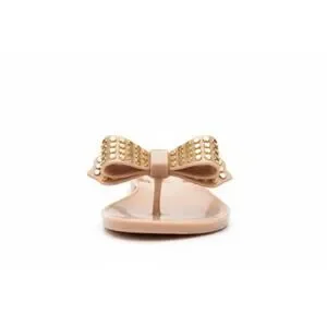 Step into warm-weather elegance with these chic studded bow jelly sandals. Featuring a sophisticated nude tone and eye-catching gold-tone studded bow embellishment, these versatile sandals transition seamlessly from beach days to casual outings.