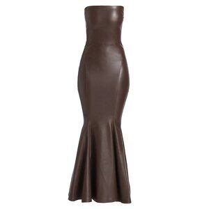 norma kamali gown strapless gown faux leather dress mermaid gown fishtail dress chocolate brown dress formal evening gown designer maxi dress fitted gown revolve dress luxury evening wear modern minimalist gown stretch dress size large