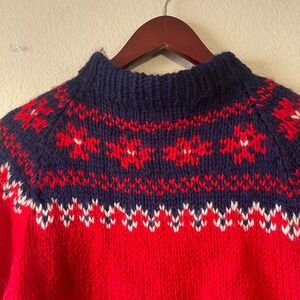 Wrap yourself in cozy charm with this authentic Danish Handknit sweater. The iconic Fair Isle pattern adorns the yoke, featuring a striking combination of deep navy, vibrant red, and crisp white for a timeless, eye-catching design. Crafted from 100% wool, this sweater promises exceptional warmth and a comfortable, natural feel. The mock neck collar adds a touch of sophistication, perfect for layering or wearing on its own. Ideal for a casual winter outing, a cozy evening by the fire, or embracing a festive holiday spirit.