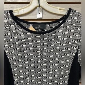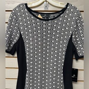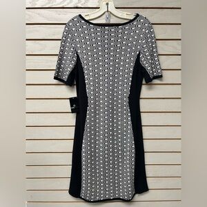 Chic mini dress with geometric pattern. Short sleeves and fitted silhouette. Perfect for stylish outings!