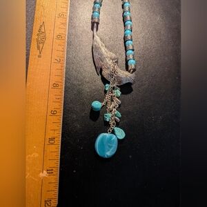 Elegant necklace featuring a silver tone feather pendant and vibrant turquoise beads. Perfect for adding a touch of sophistication to any outfit.