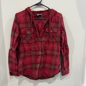 Cozy red plaid shirt with button-down front. Features dual chest pockets and a hood. Ideal for casual outings.