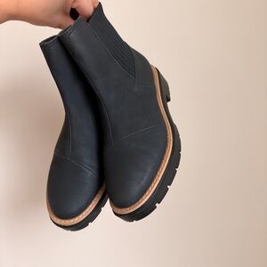 Chic black ankle boots with a sturdy tan sole. Ideal for versatile wear.