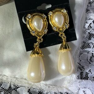 Chic teardrop earrings with a gold finish.Vintage gold tone faux, pearl rhinestone dangle, runway design style earrings measures 2.5 inches.lots of movement.Outstanding.well made.in great condition.