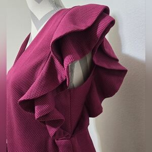 Beautiful magenta / fuschia dress with short ruffle flounce sleeves and v-neck. The dress zips up in the back and has an eye-hook closure. Great for Valentines Day, date night or a party dress.