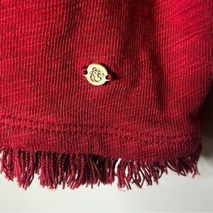 Pre-loved Spartina 449 Hudson Fringe Top in a rich Brock red hue. This long sleeve casual top features subtle fringe trim at the hem, decorative button detailing at the shoulder, and a soft, stretchy knit for all-day comfort. A versatile elevated basic that pairs perfectly with denim, trousers, or layered looks for fall and winter. Classic coastal-inspired style with relaxed polish — ideal for everyday wear, travel, or casual work settings.