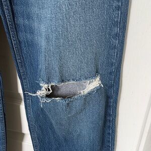 Stylish distressed blue jeans with ripped knees. Distressing at back hem as well.