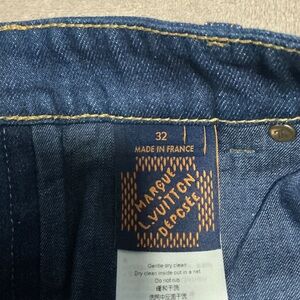 Elegant Louis Vuitton jean shorts. Dark blue denim with gold logo details. Ideal for casual elegance.