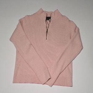 Chic and warm soft pink sweater. Features a stylish half-zip design. Ideal for layering.