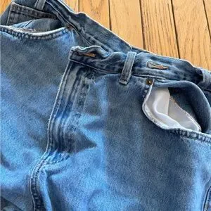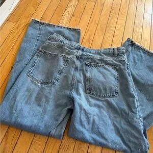 Crossover waistband Zara jeans, wide leg, baggy, missing one button - could definitely sew a button back on but I don’t know how to sew!