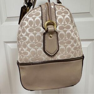 Vintage Coach Poppy East West satchel in signature jacquard with champagne patent leather trim—roomy, practical neutral for everyday style with just the right amount of sparkle.