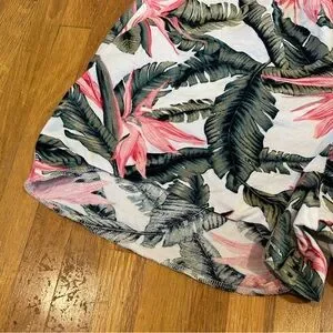 LOFT | Women’s high waist shorts with a tropical print. Features vibrant pink and green leaves. Perfect for casual outings. Some color fading and right leg backside seam has come undone (pictures 3 & 4). Two side pockets.