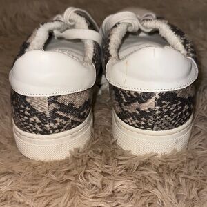 Stylish athletic shoes with a snake print design. Features bright yellow star accents. Comfortable and trendy.