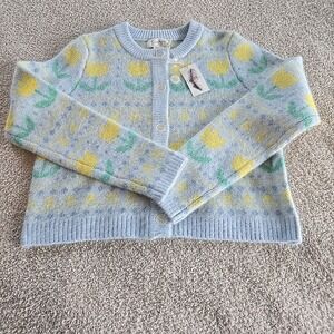 Jessica Simpson Knit Floral Cardigan Sweater Blue Yellow Tulips Size M NWT